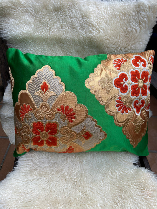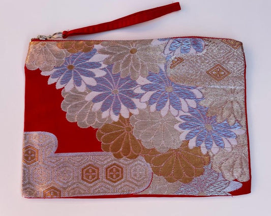 Pouch Clutch Bag - Silk OBI -Red Silver flowers